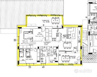 L'immobile ha una superficie di 128 mq. Il terrazzo principale, di 13 mq, funge da ingresso diretto all'abitazione, garantendo indipendenza. L'accesso avviene nella zona giorno, dove si sviluppa un ampio open space soggiorno/cucina di 35 mq, dal quale si raggiunge un corridoio che conduce alla zona notte. Qui sono presenti due bagni, entrambi con doccia, e due camere da letto.