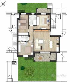 L'abitazione, situata al piano terra con doppio giardino di pertinenza esclusiva, offre spazi armoniosi, luminosi e perfettamente organizzati. Il soggiorno-pranzo, ampio e accogliente, si affaccia direttamente sul portico e sull'area verde privata, creando una continuità naturale tra interno ed esterno. È un ambiente pensato per condividere la quotidianità, accogliere ospiti e godere di un'atmosfera rilassante in ogni stagione.