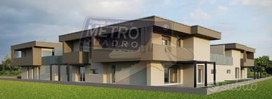 THIENE Vendesi Nuova Ampia Porzione di Casa Bifamiliare indipendente con giardino, disposta su 2 livelli in CLASSE A, ampia zona cucina-soggiorno di 54 mq con pompeiana abitabile, servizio e lavanderia al piano terra, camera matrimoniale con cabina armadio e servizio, camera doppia e camera singola, servizio, terrazzo abitabile di 40 mq al 1°piano, doppio garage parallelo al piano terra, doppio posto auto scoperto, ottime qualità costruttive e possibilità scelta finitura, predisposto impianto fotovoltaico da 6,0 Kw, zona meravigliosa e tranquilla.