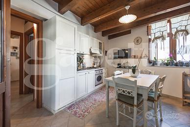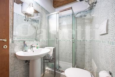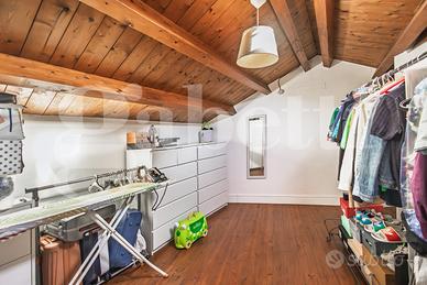 Accedendo ad una scala in legno si va nella zona mansardata dove troviamo una camera matrimoniale dalla generosa dimensiona con velux sul tetto e da un'altra stanza utilizzata come cabina armadio sempre con velux e da un bagno con vasca, anch'esso provvisto di areazione meccanica.