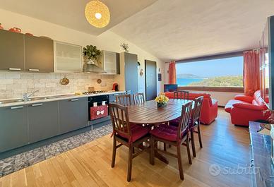 Internamente è composto da un ampio pranzo soggiorno con divano letto, dal quale si gode di una splendida vista mare, due camere, un comodo ripostiglio e due bagni.