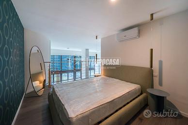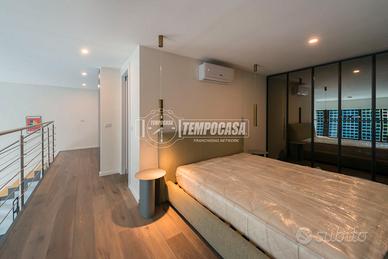 La zona superiore ospita un open space elegante, sapientemente suddiviso in due ambienti: una spaziosa camera matrimoniale e un'area versatile da personalizzare come studio, zona relax o cabina armadio, oltre al SECONDO bagno.