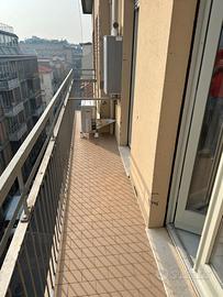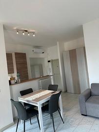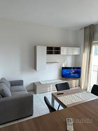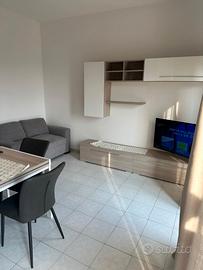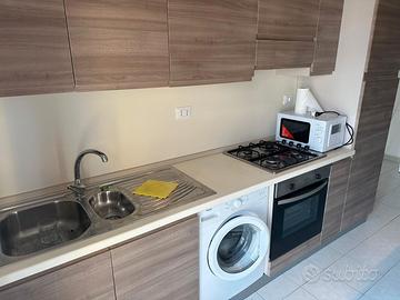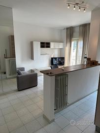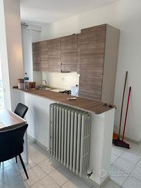 di cucina open space su soggiorno ristrutturato con porta finestra su balcone,