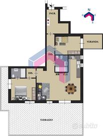 L'appartamento è composto da: Ingresso su ampia sala, disimpegno, ampia camera con veranda, servizio con doccia, ampia zona living, camera da letto con anticamera e servizio, terrazzo di 62 mq
