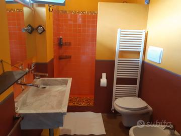 Alla nostra sinistra si apre un bel bagno molto grande con il lavello di marmo ed una grande doccia in muratura. Il primo piano si completa con una camera matrimoniale e un secondo bagno, anche questo con doccia.