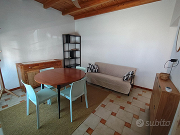 Zona giorno: Accogliente ingresso/soggiorno arredato con divano e tavolo, perfetto per rilassarsi dopo una giornata al mare.