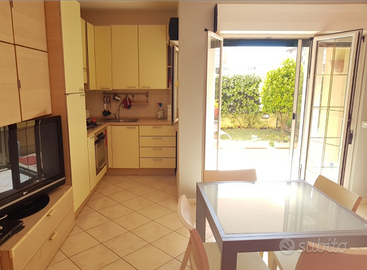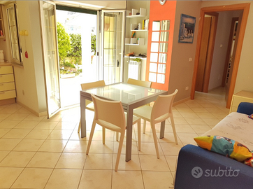 Luminoso appartamento con portico e giardino attrezzato (doccia calda, dondolo, sdraio, tavolo con sedie, gazebo) in palazzina di recente costruzione. Zona servita da supermercato e navetta per la spiaggia, 1 km dalla piazza principale. Camera da letto matrimoniale, cameretta con letti a castello e divanoletto matrimoniale in sala, bagno con doccia. Doppio climatizzatore indipendente per zona giorno e zona notte. Cucina attrezzata, zanzariere, lavatrice, lavastoviglie, forno microonde, macchinetta del caffè a cialde e 2 tv. Posto auto privato in garage condominiale. Possibilità di culla e seggiolone su richiesta senza supplemento. Condominio e acqua inclusi, utenze escluse.