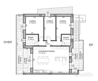 L' appartamento, al quale si accede attraverso una scala autonoma che da accesso privato alla propria abitazione, su presenta con due belle ed ampie terrazze una esposta ad est ed una ad ovest, un ampio soggiorno super luminoso con una porta-finestra con apertura di 3 metri dal quale si accede al terrazzo.