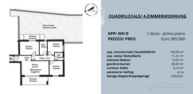 San Lugano: Immersa nel verde, ideale per una famiglia con bambini, si trova questa nuova costruzione con solo 8 unità abitative e con ascensore. L'immobile di alta qualità è stato costruito nello standard energetico CasaClima A. Gli appartamenti al piano terra dispongono di un bellissimo giardino soleggiato, gli appartamenti al primo e secondo piano dispongono di un ampia terrazza e balcone.