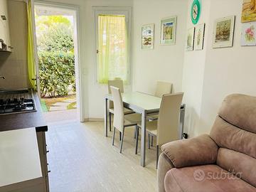 Scopri questo elegante appartamento bilocale situato al piano terra con giardino privato e ingresso indipendente in un tranquillo villaggio con piscina.