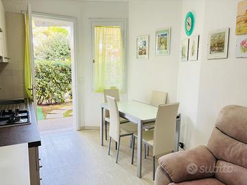 Scopri questo elegante appartamento bilocale situato al piano terra con giardino privato e ingresso indipendente in un tranquillo villaggio con piscina.
