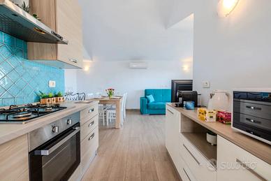 Composto da 2 camere matrimoniali, un soggiorno open space con cucina attrezzata di qualsiasi elettrodomestico e un bagno con doccia. L'arredo moderno riprende i colori turchesi del Mar Mediterraneo. Completano l'abitazione due verande coperte e un terrazzo panoramico con vista 360*.(disponibile 4 appartamenti)