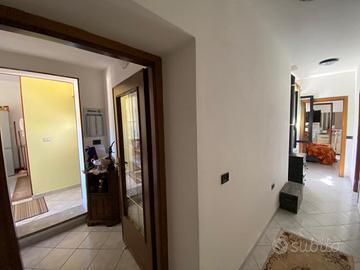 Al piano terra ci accoglie un soggiorno con angolo cottura e balcone panoramico, 2 camere, 2 bagni, cortile e garage;