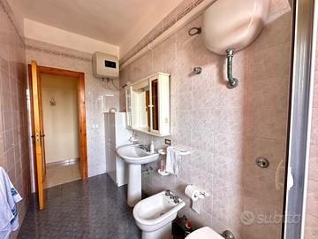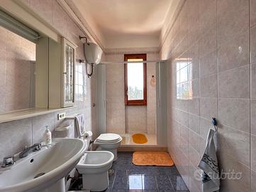 L'appartamento dispone di un bagno finestrato, completo di ampio box doccia, lavabo e sanitari.