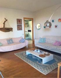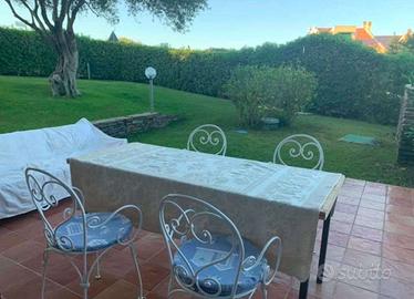 Dal soggiorno si accede allo scoperto esclusivo parzialmente coperto da tettoia dove è sistemato l'arredo da esterno per pranzare o cenare comodamente all'aria aperta. Nell'ampio giardino che si estende sia sul fronte che sul retro dell'appartamento è presente anche una doccia esterna ideale per quando si rientra dalla spiaggia.