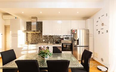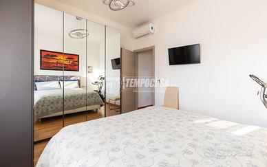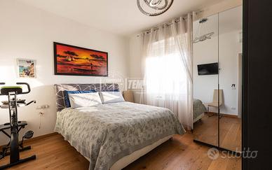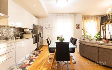 L'ingresso si apre su un ampio e luminoso soggiorno con cucina a vista, impreziosito da una suggestiva parete rifinita in pietra a vista e da una grande porta finestra che conduce al balcone. La cucina è valorizzata da un paraschizzi resistente e ben coordinato con le altre finiture, mentre il pavimento in parquet a listoni e le porte interne di alta qualità con inserti in alluminio donano calore e raffinatezza a tutto l'ambiente.
