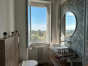 Il bagno è caratterizzato dalla luminosità e dalla bellissima cabina doccia floreale per una sensazione di relax profondo.
