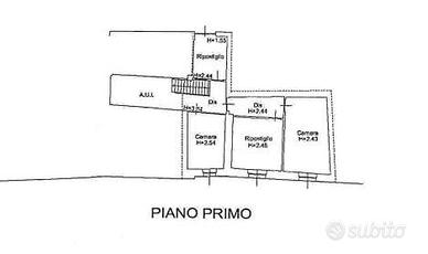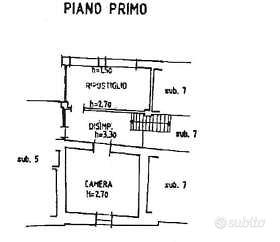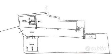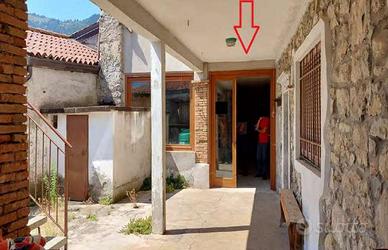 Al piano seminterrato è presente una cucina, mentre in un edificio separato si trova un servizio igienico con caminetto in muratura adiacente. Al piano rialzato, accessibile tramite scala comune, si trovano un corridoio e due camere. Al primo piano si accede a un pianerottolo privato che conduce a un ripostiglio, una stanza (ex cucina) e un corridoio che collega ad altre due camere.