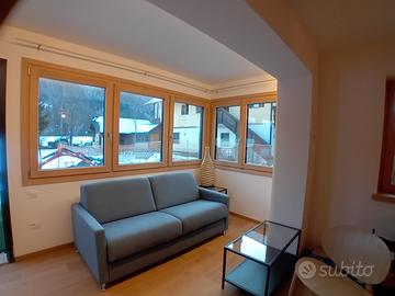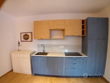 cucina abitabile, completamente accessoriata con piano a induzione e lavastoviglie e un divano letto in soggiorno;