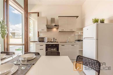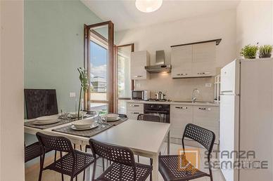 Situato al primo piano di casa indipendente, luminoso e molto spazioso. 107 mq di superficie. È composto da cucina abitabile, 2 Bagni e 7 stanze singole. L'appartamento è ottimamente ristrutturato in funzione di tutto ciò che occorre ai nostri studenti. Dotato di WI-FI fibra, lavatrice, cucina equipaggiata (forno, forno a microonde, frigorifero, freezer, e tutti gli accessori inclusi). Offre una meravigliosa terrazza di 80 mq molto luminosa e tranquilla e dispone di parcheggio interno per auto, moto bici.