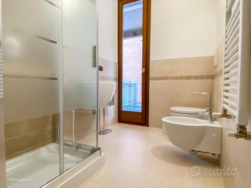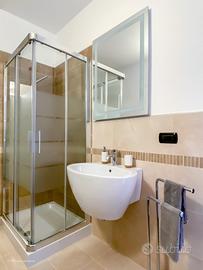 bagno dalle linee pulite, con eleganti e funzionali sanitari sospesi, un'ampia cabina doccia angolare con profili in alluminio ed ante con fascia centrale serigrafata ed una lavatrice