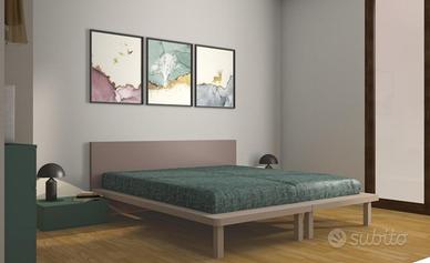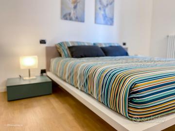 spaziosa camera da letto completa di 2 letti singoli (uniti a formare un ampio letto matrimoniale) con materassi ortopedici per garantire il massimo comfort e benessere, 2 comodini con cassetto, armadio a 4 ante con cassettiera interna, un armadio a giorno con cassettiera ed appendiabiti e 2 abat-jour dal design unico.
