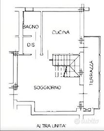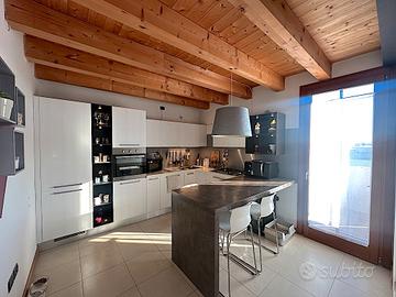 Composto da: ampio living con cucina separata abitabile collegati al terrazzo, disimpegno con spazio ripostiglio, bagno e camera di 23 mq con terrazzino, bagno e "soppalco" attualmente adibito a studio al piano superiore. Garage al piano terra.