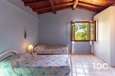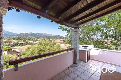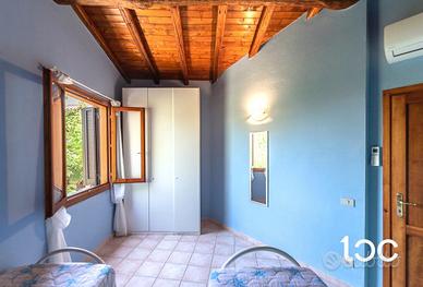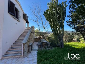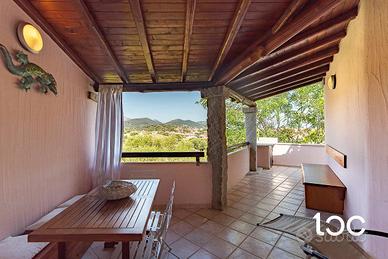 L'accesso alla proprietà avviene tramite un vialetto condiviso immerso nel verde, che conduce a una scala che porta alla veranda coperta, da cui si può ammirare una vista mozzafiato delle colline circostanti e di San Teodoro dall'alto.