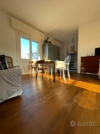 Al primo piano, salendo dal vano scale finestrato, appartamento composto da zona giorno con finestre a doppia esposizione (cucina e living) ampia camera da letto e bagno finestrato, due balconi (uno piccolo sulla facciata principale e uno grande sul retro). La casa è stata ristrutturata di recente, impianto elettrico nuovo,impianto di riscaldamento a pavimento, climatizzatore, basculante elettrica garage nuova, serramenti nuovi, pavimento in parquet. Finiture fascia alta. Nella prezzo di vendita sono compresi i mobili realizzati su misura (cucina completa di elettrodomestici e armadiature).