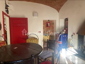 tramite una scala accediamo a un disimpegno dove troviamo di fronte un ampio salotto usato anche come camera da letto , sulla destra accediamo all' ampia cucina abitabile con un grande camino in rame, salendo al piano superiore troviamo una ampia e luminosa mansarda con camera da letto con vista panoramica sul centro del paese e sulla Maremma , un bagno finestrato con doccia e una zona lavanderia e ripostiglio.