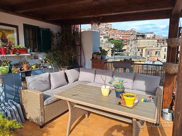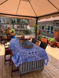 Casa indipendente cat A/2 nel parco dei castelli romani precisamente nel borgo Missori di Monte Compatri a 50 mt dal centro. Casa completamente ristrutturata di recente composta da un appartamento di 91 mq ed un un terrazzo di 85mq. La Casa: doppio ingresso, ampio salone con elegante camino in ghisa e marmo e due comode camere da letto matrimoniali con pavimento in parquet in rovere oak brown, un bagno (completamente rifatto nel 2025) ed un comodo bagno di servizio, cucina arredata di recente, un capiente soppalco, infissi in doppio vetro, portone blindato, fibra ottica. Riscaldamento e acqua sanitaria con caldaia a condensazione classe A+ ancora in garanzia. Il Terrazzo: ultra panoramico con esposizione a 360 gradi, completamente attrezzato con gazebo 4x3, tettoia in abete 1ma scelta 2x3 con chaise longue angolare completa di cuscineria e tavolo in rattan, casetta keter per attrezzi e vari alberi da frutto. Nel prezzo e' compreso l'arredamento del bagno, della cucina e del terrazzo. Vendita da privato No spese condominiali No spese di agenzia Agenzie e/o intermediari sono pregati di non chiamare.