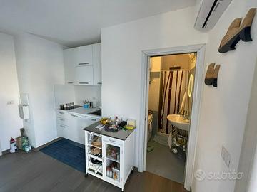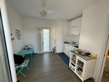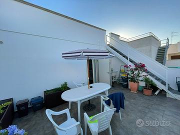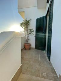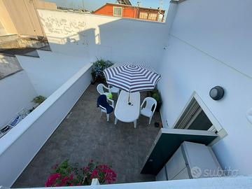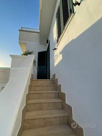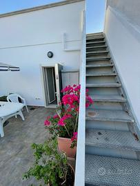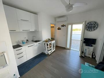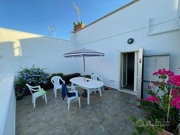 Torre San Giovanni piccolo borgo di pescatori circondato dalle pinete che in pochi anni è una vivace stazione balneare a vocazione turistica, tra le più frequentate nel sud Salento che attrae per la bellezza ineguagliabile del suo mare. In questa bella località balneare salentina proponiamo in vendita elegante pied-à-terre posto al primo piano e con ingresso indipendente. La proprietà completamente ricostruita nel 2014 è dotata di tutti gli impianti a norma e relative certificazioni, cappotto esterno, porta blindata, finestre in PVC antisfondamento, pannelli fonoassorbenti sul pavimento e sul soffitto e impianto di allarme. L'abitazione accogliente ha una metratura di 35 mq con due splendide terrazze, una di 20 mq al piano e una di 35 mq. E' l'ideale per una coppia che cerca una soluzione abitativa comoda per raggiungere il mare in pochi minuti a piedi - solo 300 mt di distanza - e i principali locali e ristoranti. Dal cancello d'ingresso saliamo una comoda scala e arriviamo al balcone dove troviamo l'accesso all'appartamento che si compone di ingresso su zona giorno e cucina con fornelli ad induzione, camera da letto e bagno finestrato. Dalla cucina/zona giorno si accede all'ampio terrazzo al piano dove potersi rilassare o prendere il sole in tutta privacy e tranquillità ma ancora più affascinate è ciò che si può godere salendo una rampa che troviamo in terrazzo: il lastrico solare di proprietà, un bellissimo ed ampio terrazzo piastrellato con vista panoramica della località e del suo mare dove poter godere di piacevoli pranzi, cene o aperitivi in compagnia. Al piano terra in ingresso spazio per due biciclette. Posto auto non assegnato. L'appartamento è dotato di pompa di calore e condizionatore con due split - uno nella zona giorno e uno nella zona notte. Ventilatori a soffitto e boiler per l'acqua calda e autoclave per l'acqua da 300 litri. Nessuna spesa condominiale. Viene venduto completamente arredato. Bellissima e accogliente soluzione abitativa adatta a 2PX