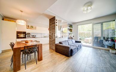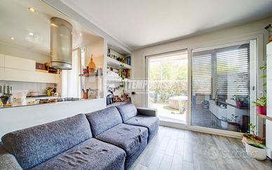 Ingresso su spazioso e luminoso soggiorno con cucina open space con sfogo tramite porte finestre sul giardino, bagno principale, camera singola e camera matrimoniale con accesso diretto al secondo bagno.