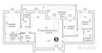 L'immobile, posto al piano primo di uno stabile costruito su due livelli e formato da solo 5 appartamenti, è così composto: ingresso su soggiorno-cucina open-space di ca 42 mq caratterizzato da grande luminosità grazie alle ampie vetrate sull'esclusiva terrazza abitabile di ca 23 mq esposta ad est, ideale per pranzi all'aperto o momenti di relax; disimpegno zona notte, camera padronale di 14,28 mq con vano cabina armadio di 5,20 mq, bagno di 5,11 mq, ripostiglio di 5,14 mq, una seconda camera singola di 10,18 mq , ulteriore camera di 10,36 mq, secondo servizio/lavanderia di 4,86 mq. Completa la proprietà un comodo garage privato di 18 mq ca, due posti auto assegnati. Presenti in zona anche parcheggi pubblici che permettono ad eventuali ospiti di sostare agevolmente in zona.