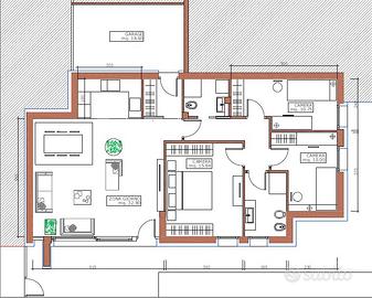 L'immobile è così composto: ingresso autonomo da scoperto privato di ca 145 mq su zona giorno di ca 40 mq, ampio disimpegno, camera matrimoniale di ca 16 mq, due singole di ca 10 e 11 mq e doppio bagno. Completa la proprietà garage di ca 18 mq dal quale è possibile accedere direttamente all'appartamento da un comodo disimpegno. Portoncino d'ingresso blindato e acusticamente isolato, serramenti esterni in mogano lamellare e scuri multistrato marino caratterizzano l'immobile.