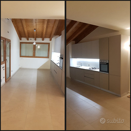 L'appartamento dispone di un elegante soggiorno cucina, parzialmente travato, con ampio terrazzo vivibile esposto a sud est, un disimpegno con angolo ripostiglio, due camere da letto e un ampio bagno.
