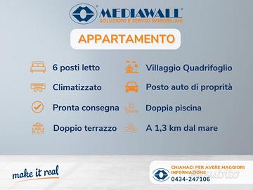 (Riferimento: BR-232-RV) BIBIONE - VILLAGGIO QUADRIFOGLIO (Rif. BR-232-RV) AMPIO E LUMINOSO APPARTAMENTO BICAMERE IN PRONTA CONSEGNA | 6 POSTI LETTO | DOPPIO TERRAZZO DI CUI UNO DI CIRCA 30MQ | POSTO AUTO DI PROPRIETA' | RESIDENCE COMPLETAMENTE RISTRUTTURATO | POSSIBILITA' DI ABITARLO TUTTO L'ANNO | IMPIANTO DI RISCALDAMENTO | CLIMATIZZATORE | DOPPIA PISCINA | CURATO GIARDINO CONDOMINIALE CON AREA GIOCHI OCCASIONE IN PRONTA CONSEGNA! A circa 1km dal centro ed a circa 1.3km dalla spiaggia, proponiamo in vendita quest'interessantissimo appartamento bicamere, posto al primo ed ultimo piano, dotato di ampi spazi, luminosità e due terrazzi di cui il principale di oltre 30mq con affaccio sul parco e piscine condominiali. L'appartamento è così composto: terrazzino che accede all'ampia e comoda zona cucina/soggiorno open-space, ampio terrazzo vivibile completamente ristrutturato dotato di locale caldaia e ripostiglio, comodo disimpegno climatizzato, due camere da letto (entrambe matrimoniali) ed il bagno finestrato con box doccia. Completa la proprietà, al piano terra, il posto auto scoperto. Entrambi i terrazzi sono dotati di tende da sole. A servizio del residence sono presenti due piscine ed un curatissimo giardino condominiale accessoriato di altalene e giochi per bambini. L'immobile, avendo radiatori, il climatizzatore e la caldaia completamente autonoma permette l'abitabilità tutto l'anno. Recentemente sono stati effettuati, a livello condominiale, importanti lavori che rendono lo stabile pari al nuovo: rifacimento totale del tetto, delle grondaie, tinteggiatura del residence ed impermeabilizzazione dei terrazzi. Una soluzione in pronta consegna che ti permette di vivere al meglio le tue vacanze; soluzione molto interessante anche per investimento. Contattaci e programma il sopralluogo a te dedicato; vieni a trovarci presso il nostro ufficio di Bibione in Corso Europa n. 6!