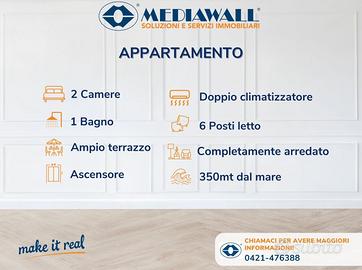 (Riferimento: BR-425-RV) Bibione (Rif. BR-425-RV) VICINANZE MARE E VICINANZE TERME | AMPIO E LUMINOSO APPARTAMENTO BICAMERE | 3° ED ULTIMO PIANO CON ASCENSORE | 6 POSTI LETTO TOTALI | AMPIO TERRAZZO ABITABILISSIMO CON TENDE DA SOLE | ACCESSO AL TERRAZZO DA OGNI STANZA | DOPPIO CLIMATIZZATORE (ZONA GIORNO/NOTTE) | OTTIME CONDIZIONI GENERALI | COMPLETAMENTE ARREDATO! A soli 150 mt da Piazza Fontana, 350mt dal mare e 350mt dalle Terme di Bibione, proponiamo in vendita questo appartamento bicamere con affaccio diretto su "Piazza Treviso" in ottime condizioni generali, completamente arredato e pronto all'uso. L'appartamento si trova al 3° ed ultimo piano (con ascensore), si sviluppa su circa 50mq interni ed è così composto: ingressino che accede su comoda cucina/soggiorno open-space, disimpegno con armadio a muro di servizio, ampia camera da letto matrimoniale, camera doppia e bagno finestrato con doccia. Completa la proprietà l'ampio ed abitabilissimo terrazzo di circa 20mq, dotato di tenda da sole, dal quale si accede da ogni stanza. L'immobile è dotato di doppio impianto di climatizzazione (zona giorno/notte) "Daikin" in pompa di calore, tutti gli infissi sono in alluminio e l'arredamento viene ceduto compreso nel prezzo. La palazzina si presenta in ottime condizioni generali e l'appartamento garantisce un'abitabilità immediata. Le spese condominiali ammontano a circa € 1.100,00- annue e comprendono: pulizia scale, luce scale, amministratore condominiale, assicurazione dello stabile, ascensore ed utilizzo dell'acqua. Contattaci e programma il sopralluogo a te dedicato e/o vieni a trovarci presso il nostro ufficio di Bibione in Corso Europa n. 6!