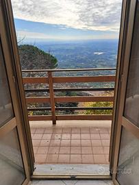 Piano Terra: zona giorno con soggiorno luminoso, cucina, bagno e un balcone panoramico con vista suggestiva.