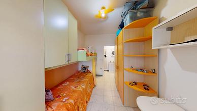 Attraverso il disimpegno si accede alla zona notte, composta da una cameretta arredata con letto a castello, armadio e scrivania, perfetta come stanza per bambini, studio o spazio multifunzione, e da una camera matrimoniale ampia e confortevole, dotata di letto matrimoniale, cassettiera e grande armadio.