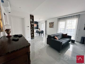 Proponiamo in vendita, trilocale al quarto piano, con ampi balconi abitabili (95mq interni, 33mq balconi) in recente costruzione (2019), zona Centro, più precisamente, in Via Severini. L'appartamento è stato oggetto di redistribuzione degli spazi interni nel 2021 e presenta una classe energetica A2, che permette di accedere al mutuo agevolato green, con conseguente tasso più contenuto. L'immobile è composto da ampia zona living, ampi balconi in zona giorno e zona notte, che rendono l'immobile luminosissimo e arieggiato, disimpegno, due camere da letto e due bagni. L'appartamento è provvisto di porta d'ingresso blindata, video citofono, infissi a doppio vetro camera, riscaldamento a pavimento controllabile a distanza con pompa di calore, pannello fotovoltaico per la corrente elettrica e pannello solare per l'acqua calda sanitaria ad uso esclusivo dell'immobile (caratteristica che permette un abbattimento delle bollette con conseguente massiccio risparmio e rimborso semestrale con bonifico per l'energia non consumata), frangisole elettrici con chiusura centralizzata. Controsoffitto perimetrale con illuminazione dimenabile domotica, condizionatori Samsung Wind Free domotici con getto d'aria diffuso. Aeratori a basso scambio termico VMC nelle camere, che permettono il ricambio d'aria e la regolazione dell'umidità senza disperdere calore e senza il bisogno di aprire gli infissi, zanzariere a tutti gli infissi, sistema antifurto domotico, allacci acqua e scarichi su balcone, illuminazione domotica Philips HUE, pavimento e rivestimenti fuori capitolato e sanitari sospesi in finitura opaca. Si propone anche acquisto cucina e mobilio presente in foto, non incluso, nel prezzo, richiesta da concordare. Oltre l'immobile troviamo un comodo box auto doppio (50mq) con vaschetta e apertura telecomandata, non incluso nel prezzo al prezzo di 65.000,00euro. Per maggiori info e appuntamenti, contattaci tramite messaggio.