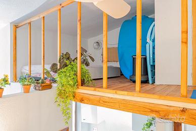 Per mezzo della scala presente in soggiorno raggiungiamo il piano superiore, costituito da un piccolo disimpegno, camera matrimoniale e bagno di servizio ricavato all'interno del vano camera.
