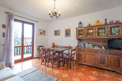 All'interno troviamo una zona giorno accogliente, dal carattere rustico tipico delle abitazioni di valle. I due ambienti sono separati: da una parte un cucinotto funzionale, dall'altra un soggiorno spazioso impreziosito da un delizioso camino e con accesso diretto al grande terrazzo, dal quale si gode di una splendida vista sul panorama circostante.