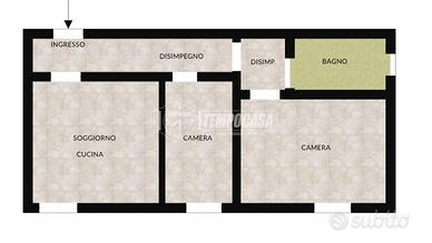 L'appartamento si apre sulla zona giorno con soggiorno e cucina a vista, proseguendo con un comodo disimpegno, cameretta, camera matrimoniale e bagno finestrato con box doccia.