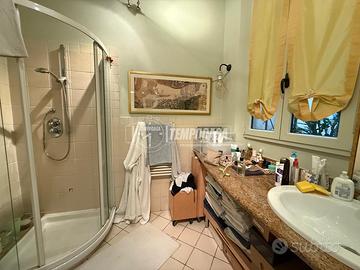 BAGNO FINESTRATO con box doccia e top in marmo.