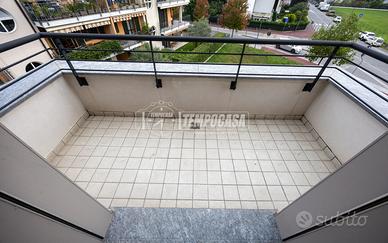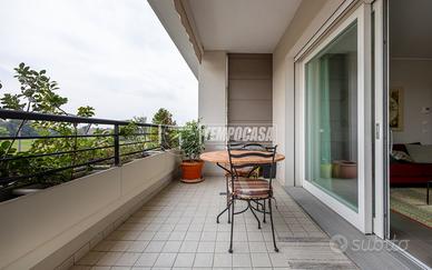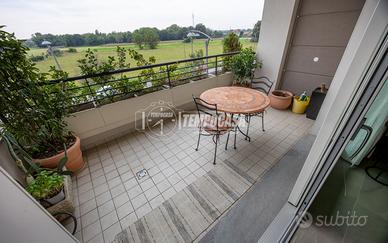 L'ingresso si apre su un ampio soggiorno con grandi vetrate che affacciano sul meraviglioso terrazzo esposto a Ovest, con tende motorizzate con sensori di luce e vento, perfetto per momenti di relax o cene all'aperto. Adiacente troviamo la cucina Veneta Cucine, completa di piano in quarzo da 2 cm, isola in pezzo unico e piano cottura a gas; l'ambiente si affaccia su un balcone dotato di impianto di irrigazione.