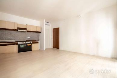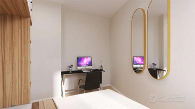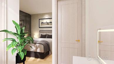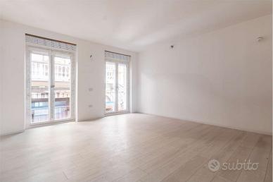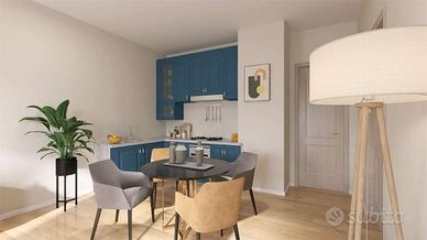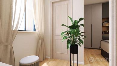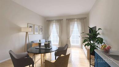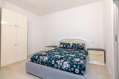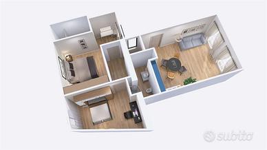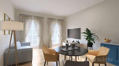 L'ingresso all'abitazione avviene dal portoncino in facciata e tramite il vano scala raggiungiamo il piano. Internamente è composto dal luminoso soggiorno con angolo cottura dotato di doppia porta finestra e balconi estetici, dal primo bagno completo di doccia e dalle due camere da letto di cui la matrimoniale con bagno padronale.