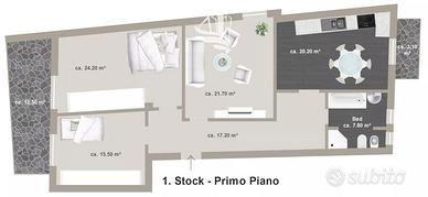 Rf.nr.: B056 In vendita proponiamo un trilocale situato al primo piano di un edificio con ascensore, a pochi minuti dal centro di Merano. L'immobile è composto da un soggiorno, una cucina separata, due camere da letto, un bagno e due balconi che offrono ulteriore spazio esterno nella vita quotidiana. Nel 2002 sono stati sostituiti i serramenti e rinnovato il bagno. L'offerta è completata da una cantina; é inoltre possibile prendere in locazione un garage. Poiché l'immobile non è convenzionato, si presta idealmente anche come seconda casa o appartamento per le vacanze, offrendo così la massima flessibilità di utilizzo. Sup. commerciale: 136,00 m² Sup. netta: 106,60 m² Cantina: 2,10 m² Anno di costruzione: ca. 1970 Ristrutturato: 2002 (finestre e bagno) Piano: 1° piano Riscaldamento: centralizzato a gas Consegna: subito Garage: disponibile Spese condominiali: ca. 250 € / mese Classe energetica: F Convenzionato: no Al fine di tutelare la privacy, precisiamo che gli indirizzi presenti negli annunci sono puramente indicativi. Per visionare l'immobile o ricevere ulteriori informazioni siamo a disposizione! Questo immobile in vendita viene proposto dall'agenzia immobiliare HOME IMMOBILIARE. Siamo specializzati nella compravendita d'immobili in tutto l'Alto Adige, i nostri punti di forza sono soprattutto la trasparenza e la professionalità. Inoltre, accompagniamo ogni cliente dalla proposta d'acquisto fino all'atto notarile. Siamo inoltre lieti di valutare la Vostra proprietà gratuitamente, in modo che tu sappia esattamente quale prezzo puoi ottenere.