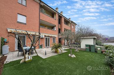 In una zona residenziale tranquilla e ben curata di Agrate Brianza, in via Monte Resegone 4, proponiamo in vendita un ampio trilocale di circa 110 mq interni, situato al piano terra di una palazzina recente edificata nel 2001.L'ingresso apre su un soggiorno di generose dimensioni, particolarmente luminoso e ideale per chi desidera vivere ambienti ampi e confortevoli. Accanto si trova la cucina abitabile, anch'essa di comode dimensioni. Sia dal soggiorno che dalla cucina è possibile accedere direttamente al giardino privato di circa 100 mq, uno spazio esterno riservato e perfetto per la vita all'aperto.Tra il soggiorno e la cucina è collocato il primo bagno, finestrato, comodo per la zona giorno e per gli ospiti.Un disimpegno conduce alla zona notte, composta da due camere da letto spaziose e ben proporzionate. Prima di accedere alle camere si trova il secondo bagno, ampio e cieco, pensato a servizio della zona notte. Fronte cameretta è presente un grandissimo ripostiglio, ideale anche come locale guardaroba grazie alla possibilità di armadiatura su misura.Dalle camere si accede a un grande porticato coperto di circa 50 mq, uno spazio esterno di notevole valore, vivibile e sfruttabile durante gran parte dell'anno, che garantisce privacy e continuità tra interno ed esterno.L'abitazione è dotata di aria condizionata con pompa di calore e di caldaia autonoma a condensazione, elementi che assicurano comfort abitativo ed efficienza energetica durante tutto l'anno.L'immobile si distingue per l'ottima luminosità, la funzionale distribuzione degli spazi e la presenza di ampie aree esterne, caratteristiche che lo rendono una soluzione abitativa completa e molto ricercata.Completano la proprietà una spaziosa cantina e un box doppio collegato direttamente alla cantina, disponibile al prezzo di 25.000 euro.Soluzione ideale per famiglie o per chi è alla ricerca di una casa recente, con spazi generosi, giardino e porticato, inserita in un contesto tranquillo e residenziale.