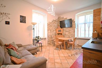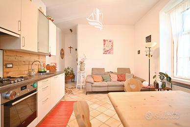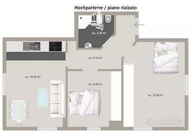 L'appartamento si trova al piano rialzato di un condominio e presenta una distribuzione degli spazi ben studiata. Il soggiorno è collegato in modo armonioso alla cucina e rappresenta il cuore dell'immobile. Una camera da letto e un ulteriore vano offrono sufficienti possibilità di privacy, mentre il bagno è funzionale e ben organizzato. Quasi tutto l'arredo resterà nell'immobile, offrendo una soluzione pronta all'uso.